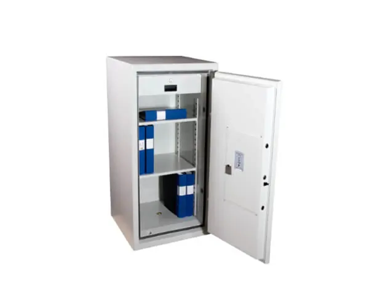 ES 130, 120P är brandsäkra dokumentskåp som skyddar papper vid brand. Skåpen är testade och godkända enligt NT Fire 017 i 120P papper. Skåpen är inredda med flyttbara hyllor för A4-pärmar samt en låsbar låda. Lådan kan lätt demonteras och då kan utrymmet nyttjas till pärmförvaring. Skåpen är som standard utrustade med elektroniskt kodlås med två utbytbara koder. Låset är borrskyddat med en sprängsäkring som låser regelverket vid inbrottsförsök. Brandklass: Brandsäkert i 120 min. Utv. mått mm: H: 1171 B: 585 D: 507 Inv. mått mm: H: 1012 B: 426 D: 346 Vikt 220kg