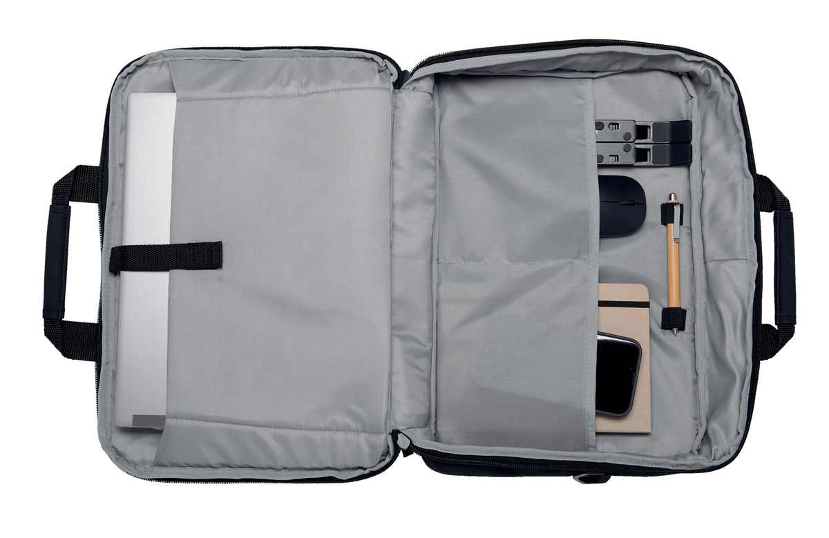 Den här väskan är till 52% tillverkad av PCR-polyester där 23 plastflaskor på 250 ml har använts. Laptopväskan är modern och resvänlig och har plats för laptops på upp till 16 tum (inklusive notebooks på 15,6 tum) och har ett vadderat fack. Ett fack framtill med dragkedja och flera fickor ger enkel åtkomst till viktiga papper och tillbehör. En vadderad axelrem ger stöd åt nacke och axlar, och en väskrem gör att den enkelt kan fästas på bagage med hjul. Den frontmatade designen gör att säkerhetskontroller går smidigare.