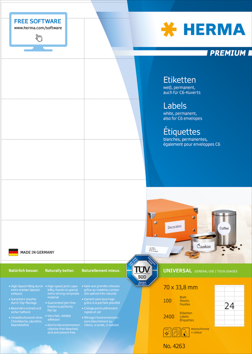 Problemfria utskrifter, testat och bekräftat av TÜV SÜD. Extra kraftiga etiketter – lätta att lossa och fästa. Fäster säkert även på kalla och fuktiga ytor. Hög vithetsgrad och jämn yta för bästa utskriftsresultat i svart och färg. Blekt utan klor, syrafritt och lim utan lösningsmedel. För laser, bläckstråle och kopiatorer. 100 A4-ark/förp.