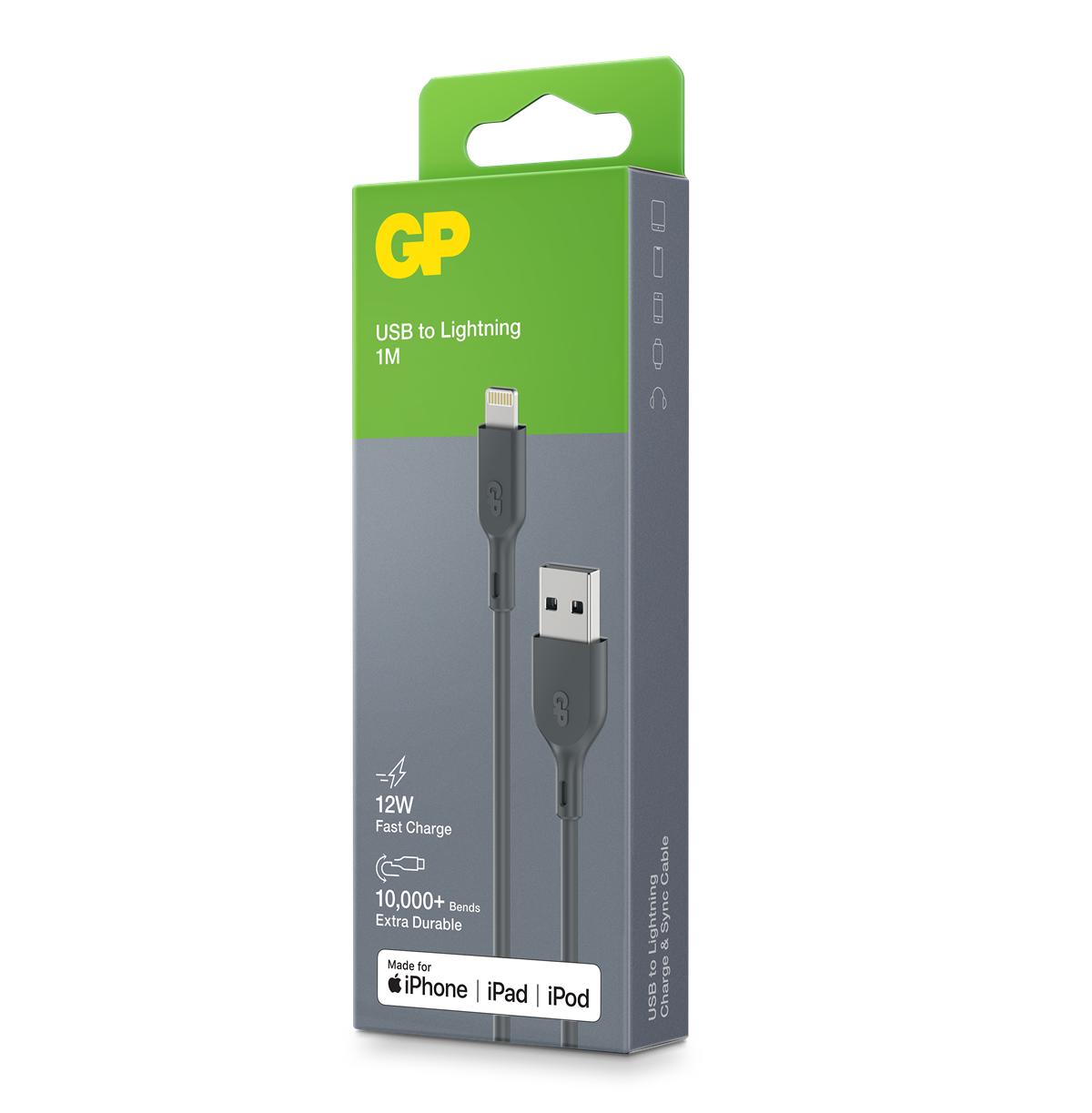 Charge & Sync-kabeln från GP är den perfekta kabeln för daglig användning. Kabeln är tillverkad av böjligt material som gör att den kan sträckas och böjas över 10 000 gånger utan att gå av. Den är MFi-certifierad och har en maximal uteffekt på 12 W vilket gör den perfekt för Apple-produkter. Kabeln kan användas för 480 Mbps höghastighetsöverföring av alla filtyper så att data kan överföras blixtsnabbt.