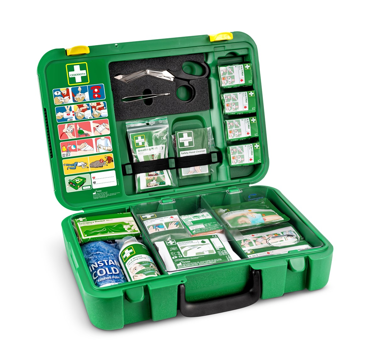 En rejäl och välutrustad Första Hjälpen-väska konstruerad i hårdplast för att hålla damm, fukt och smuts utanför även i hårda miljöer. Plåsterautomaten på utsidan gör det enkelt att ta ett plåster samtidigt som innehållet i väskan hålls orört och hygieniskt rent. I väskan ligger produkterna överskådligt indelade i fack och det är lätt att hitta rätt produkt när varje sekund räknas. I locket finns bland annat handskar, andningsmask, sax och pincett. Alla produkter är försedda med tydliga självförklarande instruktioner. Smarta röda refilldekaler i väskan signalerar när det är dags att fylla på en produkt. Väskan kan även fästas på väggen som ryckväska. Mått: B 420 x H 300 x D 118 mm.