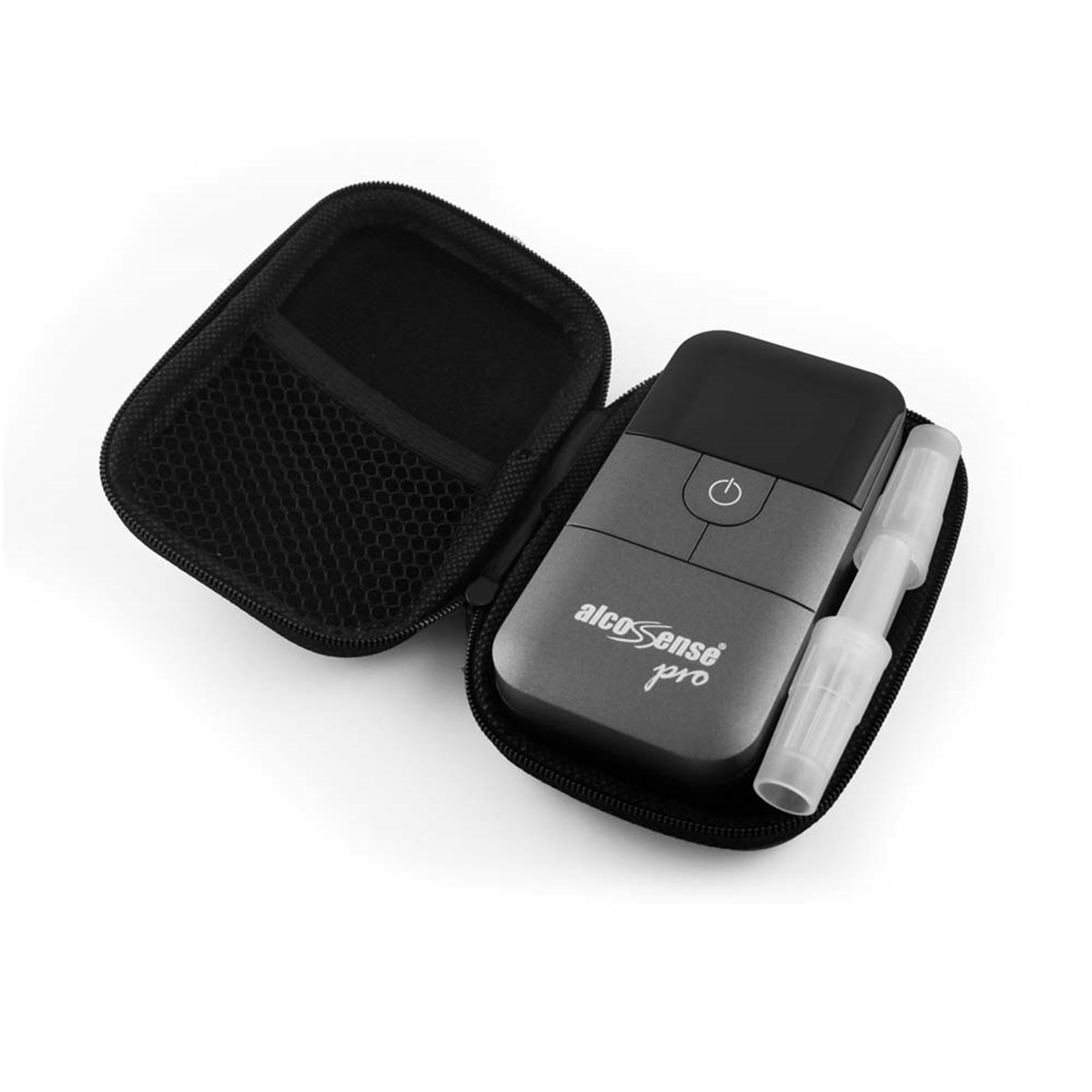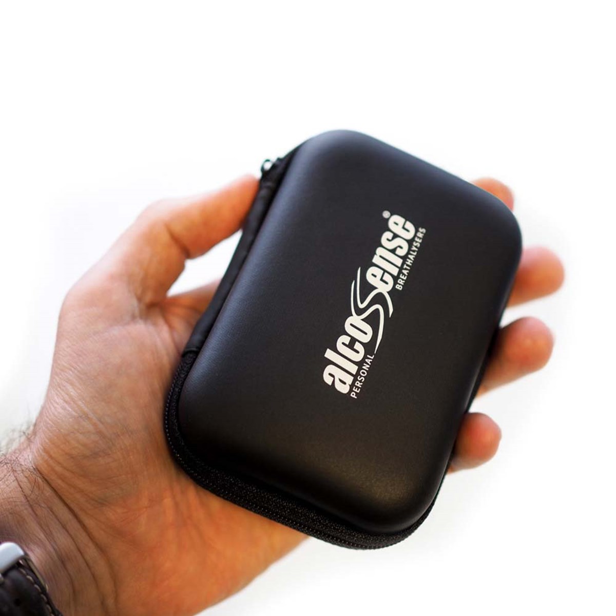 Väska tillverkad av hårdformat material. Plats för AlcoSense alkoholmätare samt blåsrör. Inuti väskan hittar man en nätpåse till förvaring och utanpå en dragkedja för att hålla väskan stängd och säker. Mått: 80x118x42 mm.