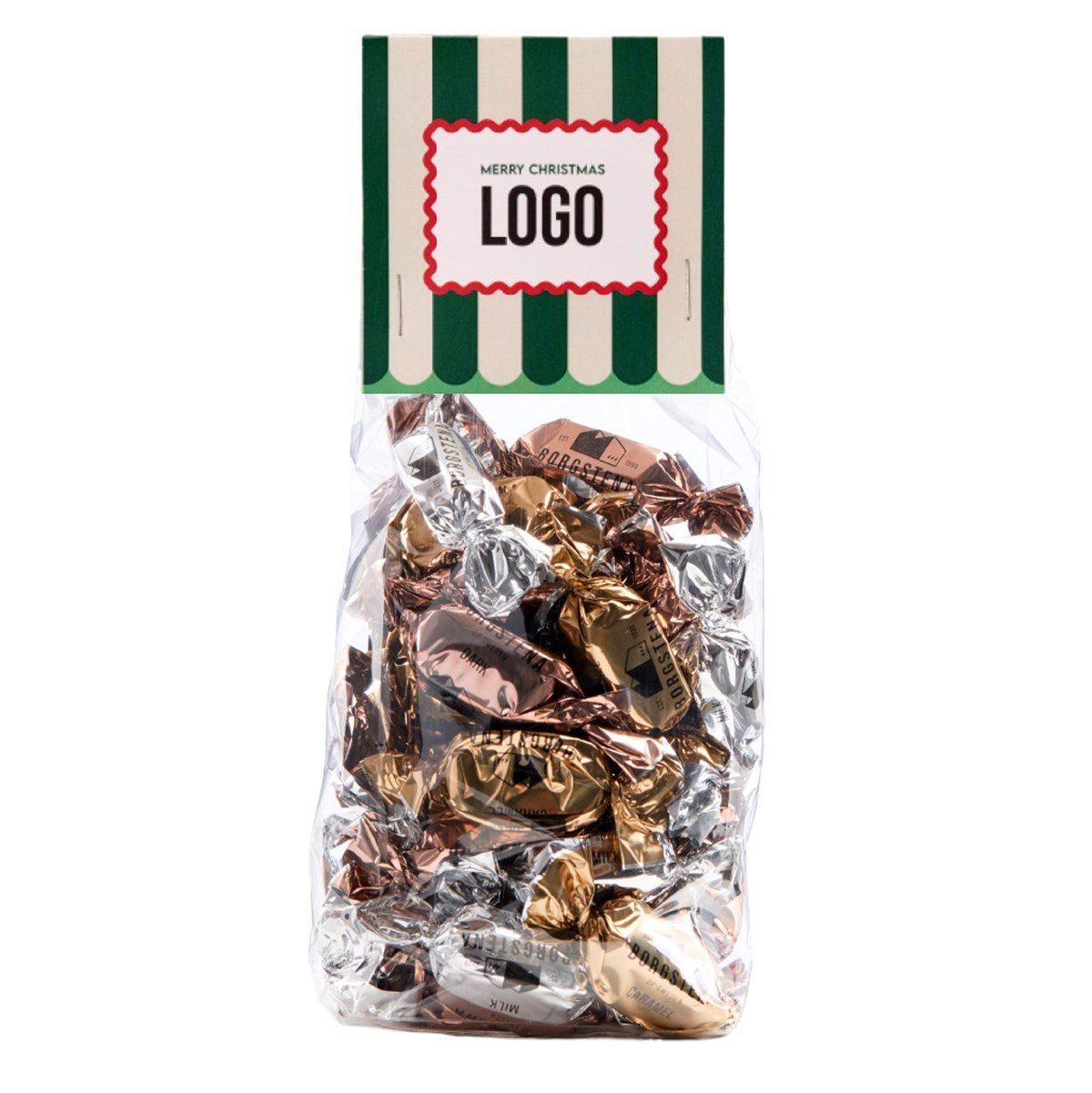 Cellofanpåse i återvunnen plast fylls med 250 g Cacao Trace-certifierad choklad från Borgstena. Glutenfri och svensktillverkad. Tryck din logga eller ditt budskap på produkten. Förpackningen har vattenbaserade färger och med FSC-certifierat papper.
