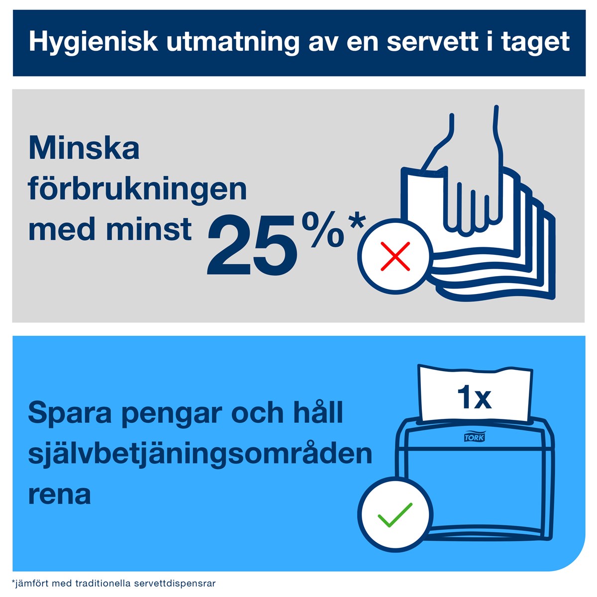 2-lagers servetter som är större som ovikta Kompatibel med heltäckande dispensrar som skyddar servetterna Unik förpackningslösning som skyddar buntarna vid förvaring och hantering Kontrollera förbrukning och kostnader med utmatning av en servett i taget Elegant lövdekor