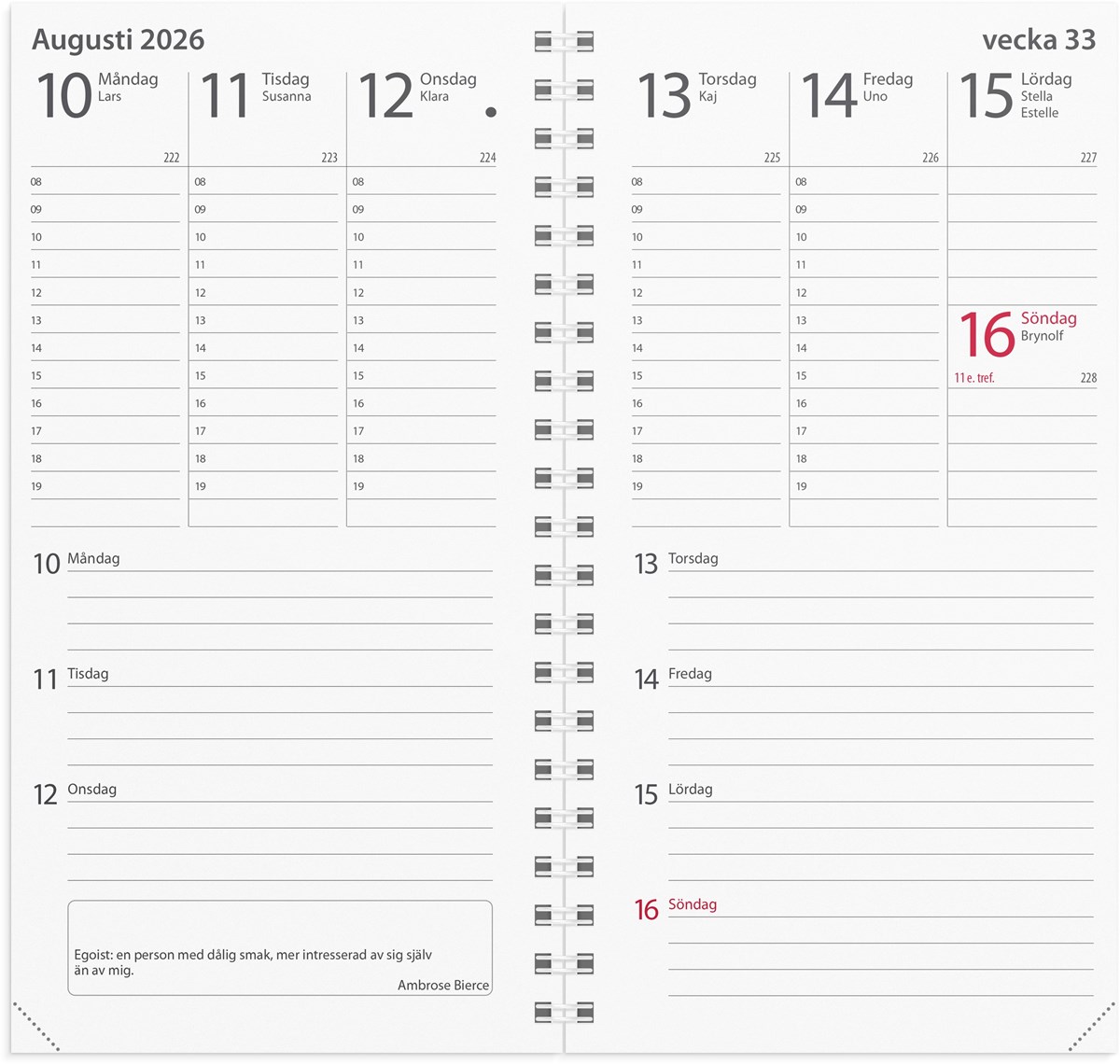 Format: 83x158 mm. Layout: Vecka/uppslag. Timindelning 8-19. Kalendarium: 2025-12-15 - 2027-01-03. Omslag: Kartong. Spiralbunden. Innehåll: Kyrkliga helgdagar, Flaggdagar, Helgdagar/aftnar, Månfaser, Namnsdagar, Internationella helgdagar översikt, Temadagar/händelser, Årsöversikt/årsöversikter, Årsplan/årsplaner. Antal sidor: 128. Miljöinformation: FSC®.