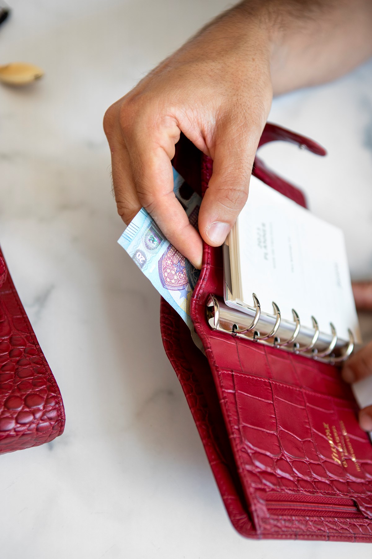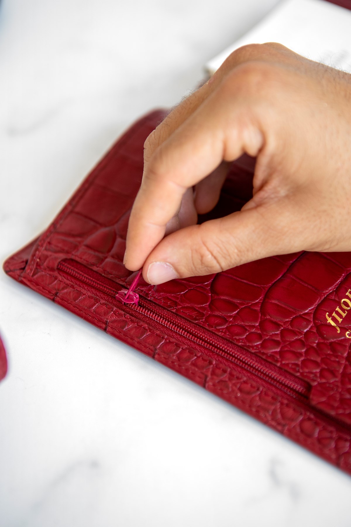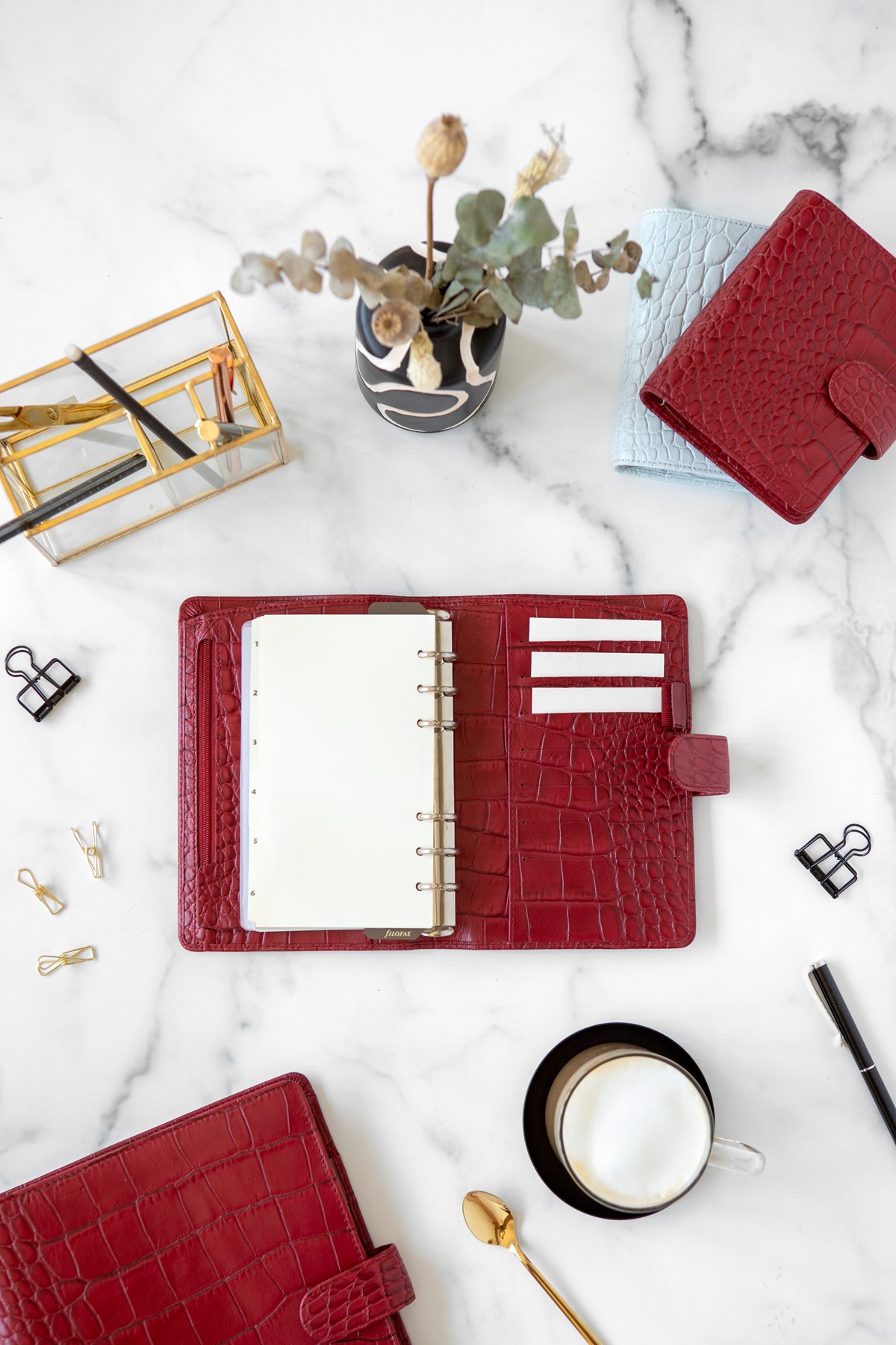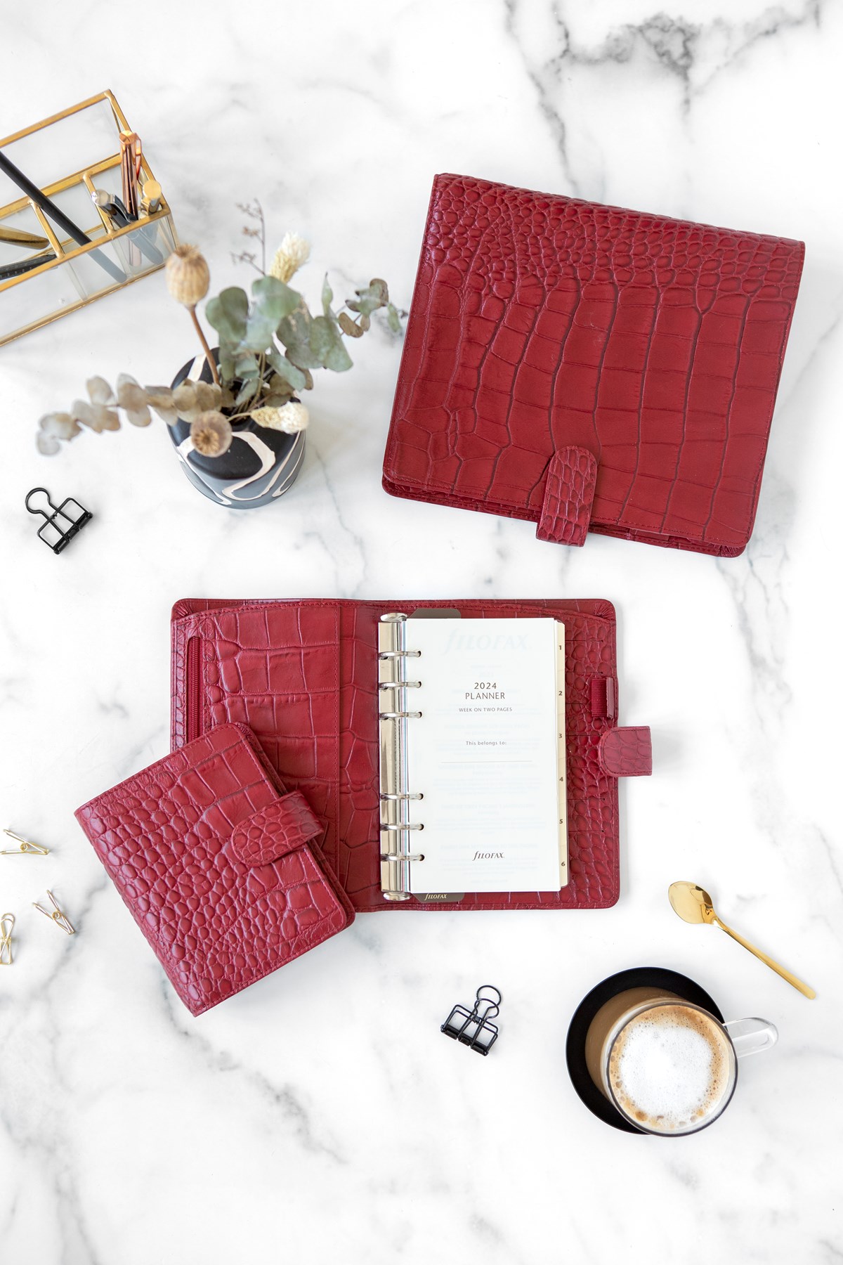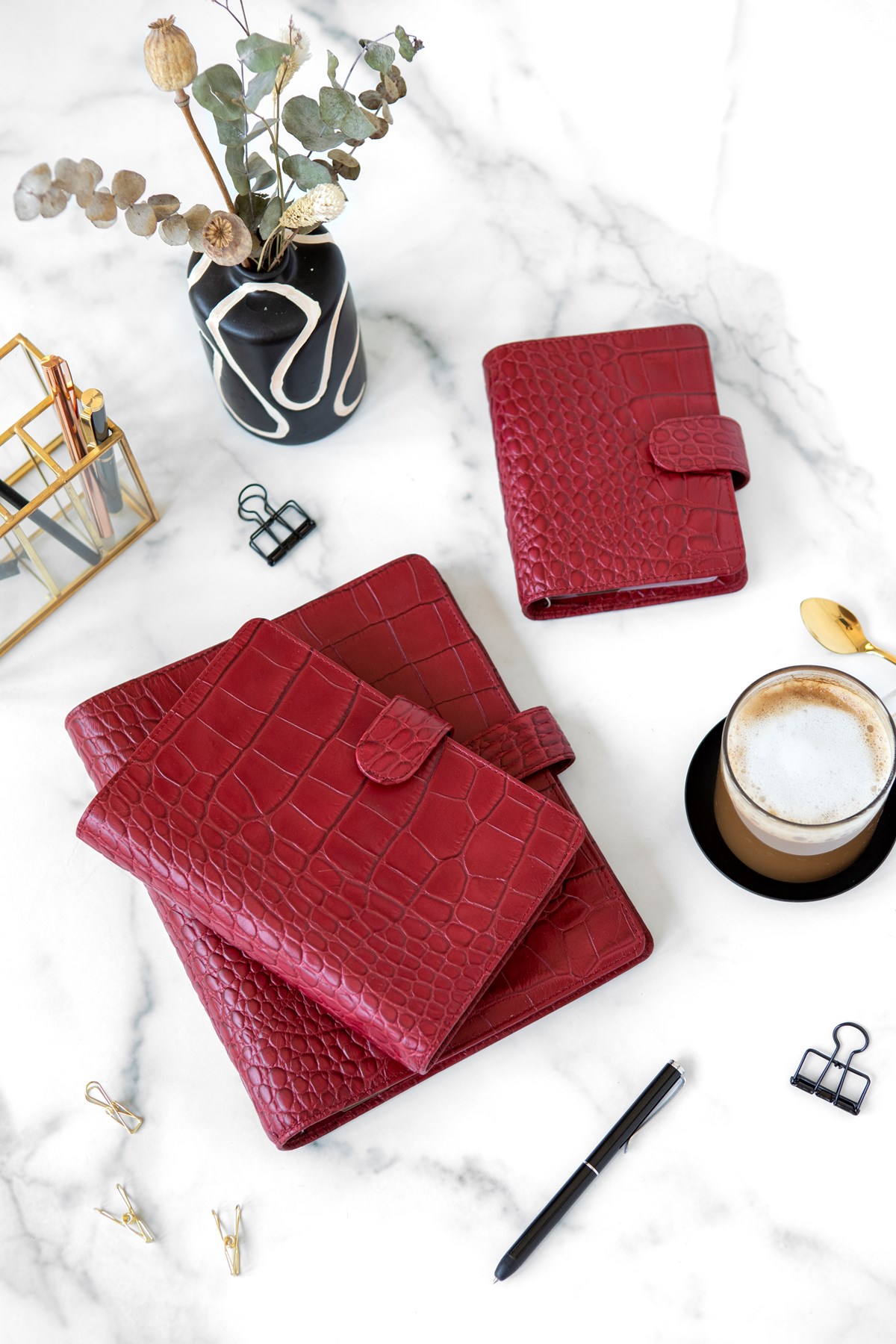 Härligt mjuk pärm tillverkad av lyxigt italienskt kalvskinn med krokodilmönster. Rustad med stor ficka för lagring av större anteckningar. Dagbok vecka per uppslag, linjal/sidomarkör, att göra lista, kontakter, index, vit anteckningsblock, färgad anteckningsblock.