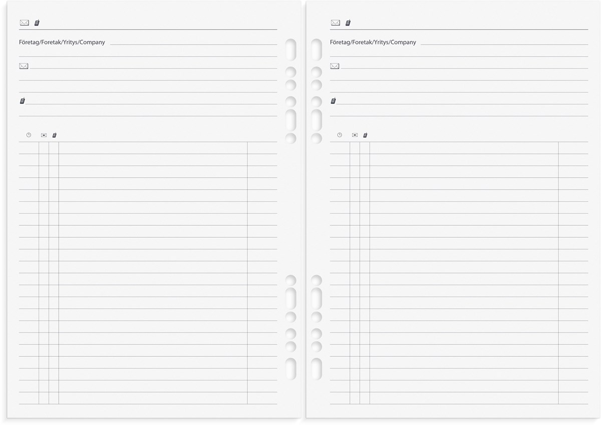Systemkalender med grundsats. Grundsatsen innehåller hålad kalenderdel (4801) och blankettdel. Pärmen har ringmekanism (Ø 30 mm), fem kreditkortsfickor, stort myntfack med dragkedja, fack för kvitton o dyl och pennhållare. Format pärm: 185x235 mm (A5).