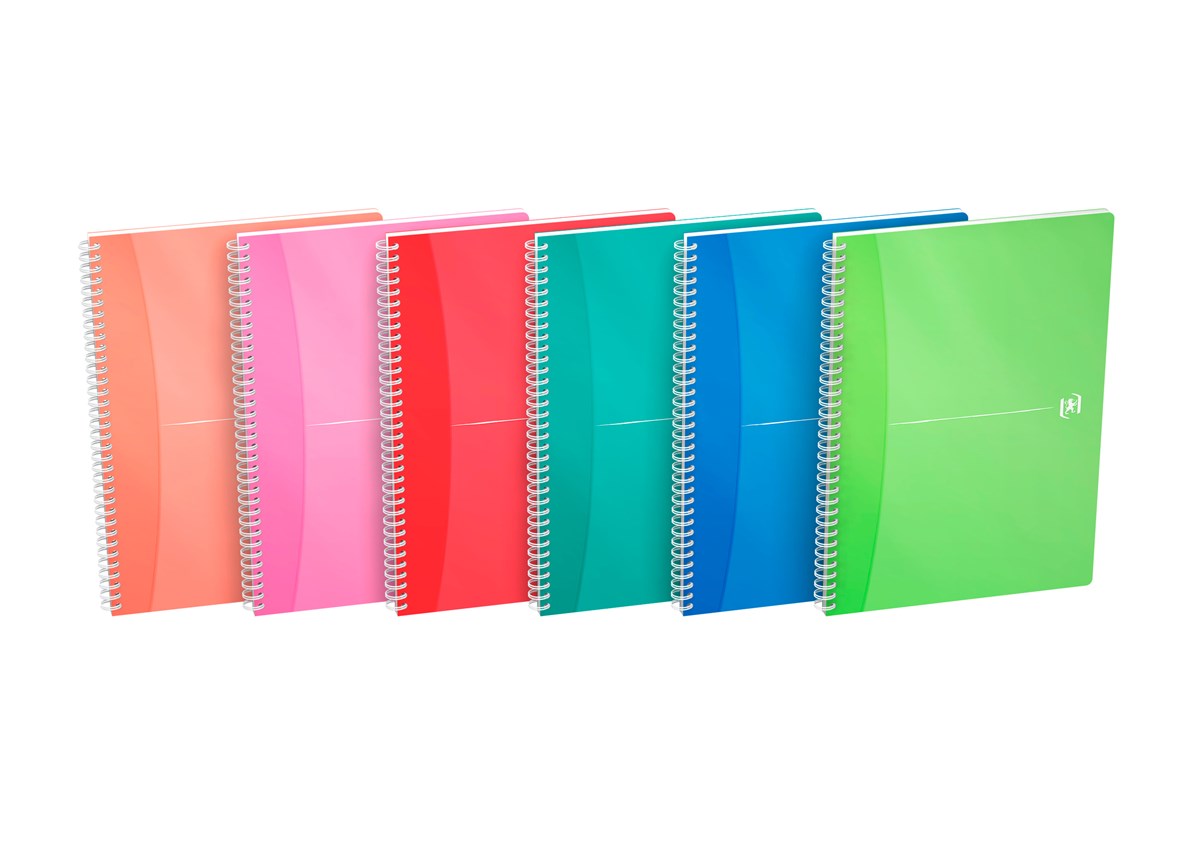 Omslag i transparent och slitstark polypropylen och slitstark, vit twin-wire-spiral som inte fastnar i väskan. 90 g optiskt vitt, linjerat papper som motverkar motljus och är behagligt att skriva på. Blandade färger. 5 st/förp.