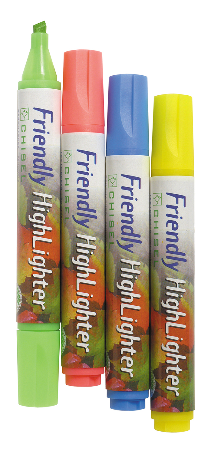 Svensktillverkad överstrykningspenna med pennkropp av miljöanpassat naturvaxat returpapper. Vattenbaserat bläck i fluorescerande färger. Spetsbredd 1–4 mm. 10 st/förp.