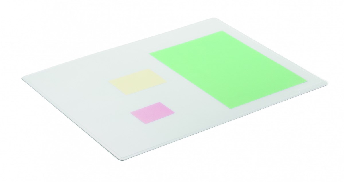 Transparent, icke reflekterande skrivbordsunderlägg av PP. Anteckningar kan förvaras lättillgängligt och synligt under skrivunderlägget.