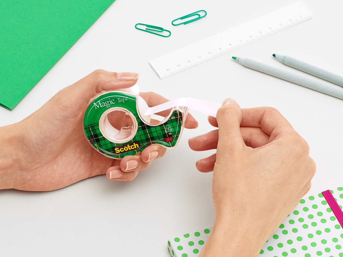 Tejpen för alla kontor. Arkivbeständig, osynlig och skrivbar tejp av förnybar cellulosa och med vattenbaserat häftämne. Inkl. tejphållare. Förpackningen är gjord av upp till 82 % returpapper.
