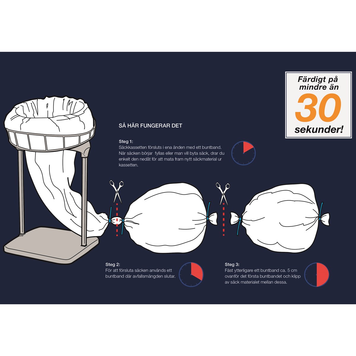 Longopac säckkassett är hygienisk och smart då byte och förslutning av säck sker från säckens utsida, vilket gör att användaren undviker kontakt med avfallet. Säckkassetten är tillverkad i 3-skikts polyeten vilket ger en låg åtgång på råvaror och hög styrka. 85 m lång säckslang. Clips för förslutning av säcken medföljer.